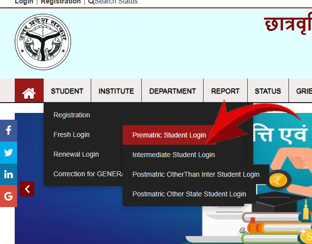 उत्तर प्रदेश स्कॉलरशिप सबसे पहले जो गवर्नमेंट @scholarship.up.gov.in की साइट आएगी। उस पर आप लोगों को क्लिक करना है, उसके बाद आप लोगों को स्टूडेंट वाला ऑप्शन ढूंढना है। जैसे ही आप लोग उस पर क्लिक करेंगे, आप लोगों के सामने कई सारे ऑप्शन ओपन होंगे पहले फ्रेश LOGIN दूसरा रेनवाल LOGIN तो जो भी आप लोगों का फॉर्म अप्लाई हुआ है। इस पर आप लोग क्लिक करें, तो उसके बाद आप लोगों को प्री मैट्रिक और इंटरमीडिएट और पोस्ट मैट्रिक का ऑप्शन दिखेगा आप लोगों ने जिस भी क्लास का ऑनलाइन किया है। उस क्लास पर आप लोगों को क्लिक करना है, उसके बाद आप लोगों के सामने रजिस्ट्रेशन नंबर मोबाइल नंबर और पासवर्ड मांगेगा, आप लोगों को यह तीनों चीज भर देना है।
